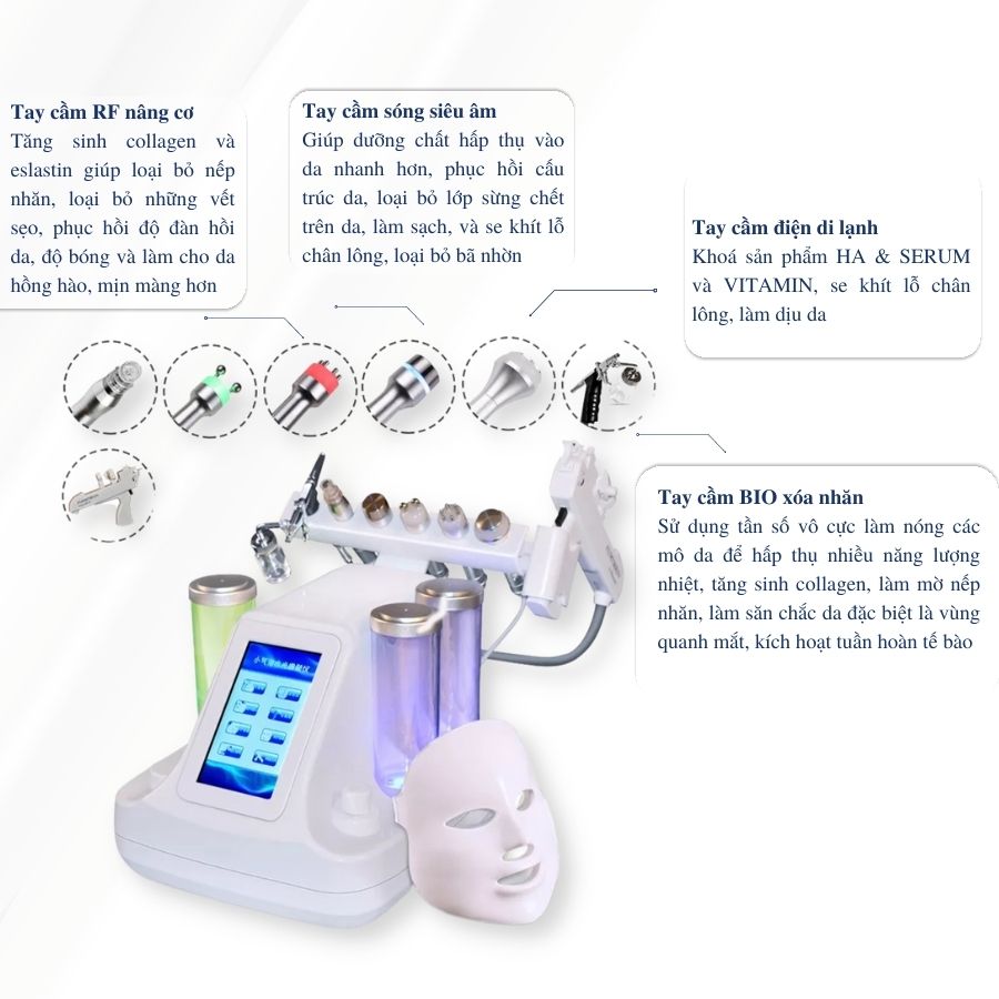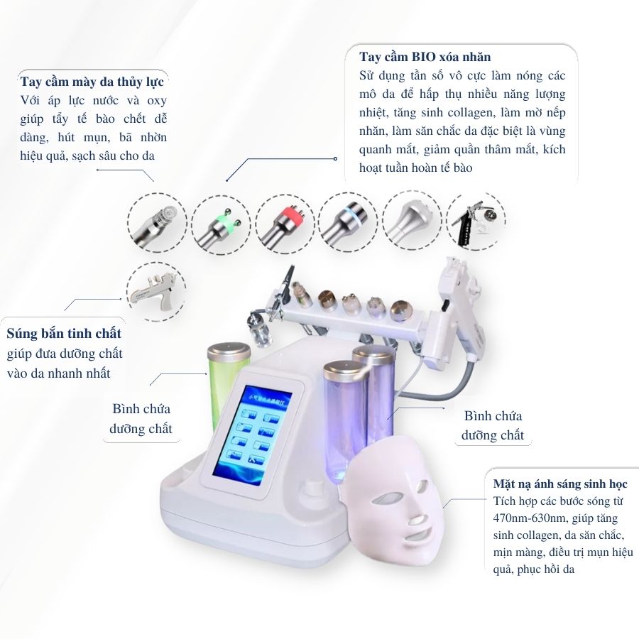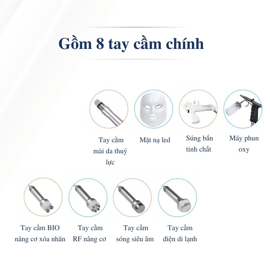 Máy chăm sóc da 8 in 1 là thiết bị thẩm mỹ đa chức năng mà những Spa lớn hay nhỏ đều phải sử hữu. Máy chăm sóc da 8 in 1 với 8 đầu điều trị chuyên biệt giúp Spa mở rộng thêm nhiều dịch vụ chăm sóc da và điều trị da cho khách hàng, giúp khách hàng đa dạng nhiều sựu lựa chọn trong quá trình làm đẹp như là nâng cơ RF, xóa các nếp nhăn trên khuôn mặt, giúp lưu thông hệ bạch huyết, loại bỏ da chết, làm da sạch sâu, hỗ trợ điều trị mụn hiệu quả, giúp các dưỡng chất và serum dưỡng da hấp thụ nhanh,…