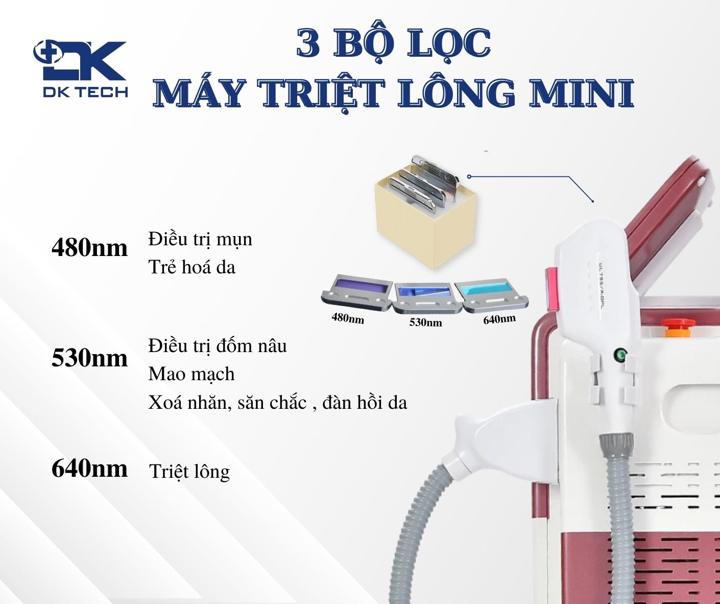 Tích hợp 3 bộ lọc 480nm, 530nm, 640nm làm cho quá trình điều trị được phân đoạn và chính xác hơn. Đi kèm với đầu làm mát, giúp duy trì nhiệt độ ở mức ổn định không làm tổn thương nang lông, vì thế đa tác dụng trong điều trị